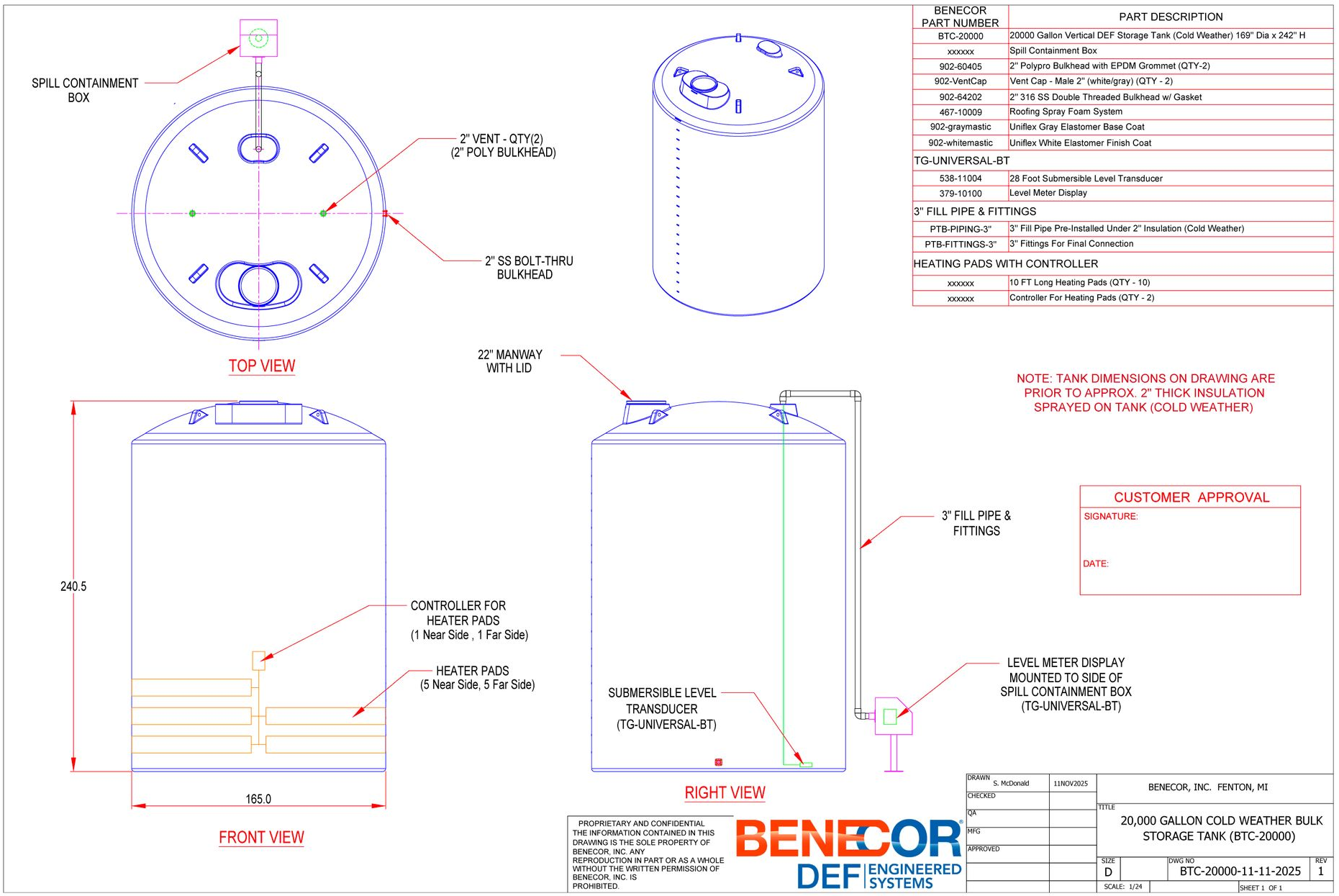 Benecor’s integrated heating and control systems deliver reliable thermal regulation, reduced energy loss, and continuous operational stability. This design directly mitigates cold-weather risks such as freezing, chemical degradation, pumping challenges, and tank stress, protecting both the stored chemical and the facility itself.